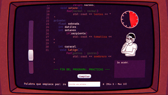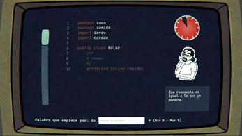 Seleccionas un profesor a desafiar, y al empezar el examen debes ir escribiendo palabrejas en la cajita que cumplan con los requisitos (empiecen por las letras especificadas y sean de la longitud indicada). Al pulsar enter, si la palabra es correcta se añade al programa, que simula un programa real rellenando las ambigüedades con tus palabras.
